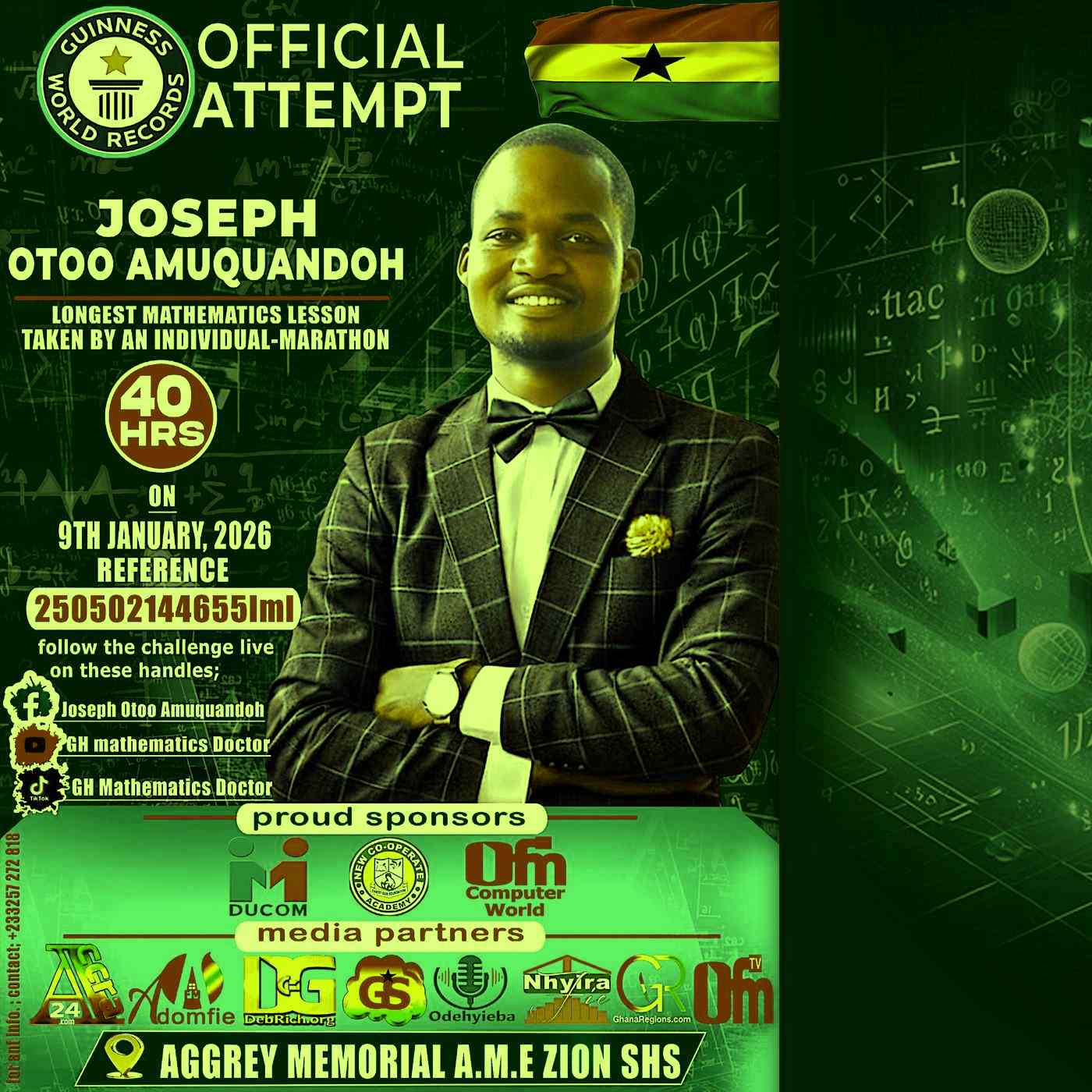 Ghana is gearing up for a landmark educational moment as Joseph Otoo Amuquandoh prepares to challenge the Guinness World Record for the Longest Mathematics Lesson. Set for January 9, 2026, at Aggrey Memorial A.M.E. Zion SHS in Cape Coast, this 40-hour marathon aims to elevate mathematics education, inspire students, and position Ghana as a champion of academic excellence.