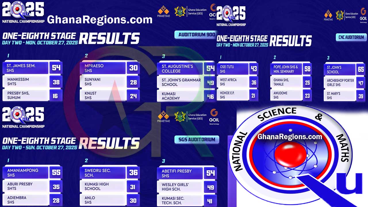 2025 National Science & Maths Quiz (NSMQ) fixtures, results, and live updates — one-eighth (Round of 16), quarterfinals, semis, and grand finale. Fixtures, seeded schools, standout results, where to watch, and FAQs.
